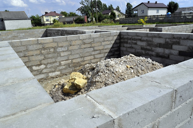 Musieliśmy domówić 600 sztuk bloczków, bo brakło - nie przewidzieliśmy, że teren jest tak nierówny, że poszło prawie drugie tyle. Z przodu domku podmurówka zrobiona jest na 5 bloczków, a z tyłu z jednej strony na 8, a z drugiej aż 11 (!!!).